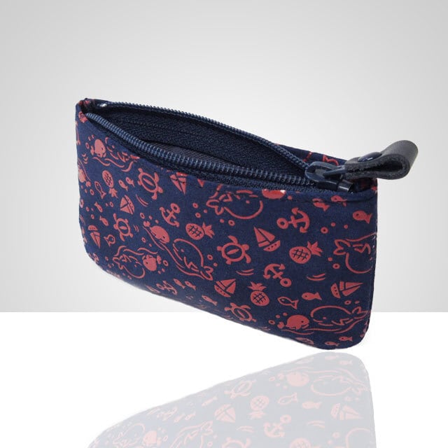 ファスナーの両サイドに外ポケットの口が2つある小銭入。ちょっとカードを差し込んですぐに取り出すことができます。ポケットの位置が高いので正面から見て、柄が途中で横に切れません。