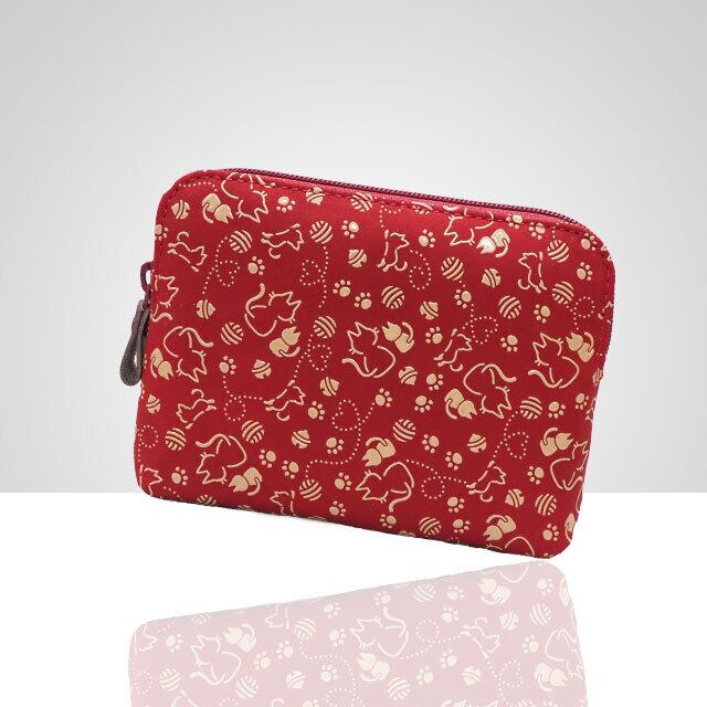 二匹のねこが仲良く寄り添う後ろ姿や、毛糸玉を元気に追いかける子猫が可愛らしい、猫好きに一押しの商品です。色は赤地に白漆の元気でポップな色合いです。はっきりした色だとカバンのなかでも探しやすく、小物は派手めがおススメです。